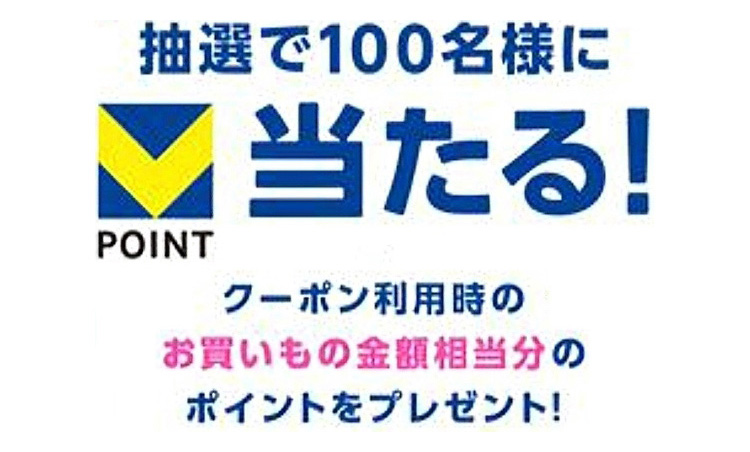 期間中に対象のVカードクーポンの利用条件を達成した方の中から抽選で、条件達成時のお会計で貯まる通常ポイント数×200ポイントが、特典ポイントとして抽選で100名に当たるクーポンキャンペーン。
