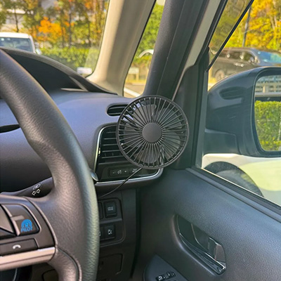 - 燃費向上!エアコンの冷たい風を扇風機で循環させることで効率よく車内を冷却。