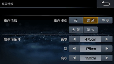 駐車場を探す際のルート案内では、あらかじめインストール済みの車両情報を基に車両サイズにあった駐車場のみを選んで表示。高さ制限で駐車場に入れないなどのトラブルを回避できます。