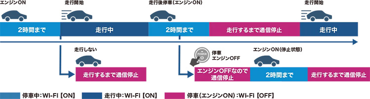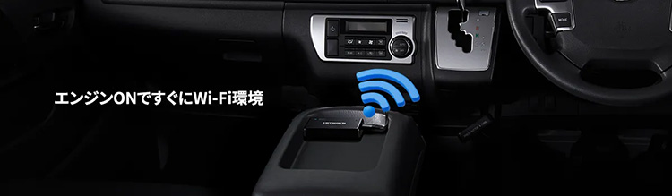 エンジンONですぐにWi-Fi環境に。走行中は無制限、停車中の利用は最大2時間!