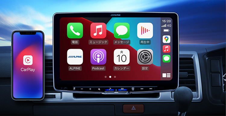 音楽好きのためのハイレゾ対応、新デザイン・サウンドホームで音を操り格別なドライブを。Apple Carplay/Android Auto、HDMI入出力/AUX入力/アルパインダイレクト接続に対応。スマホアプリの動画を楽しめる他に幅広いシステムアップが可能。